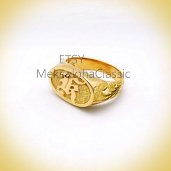 10mm Hawaiian Heirloom Signet Initial ring 14k gold Black enamel letter Engraved Scroll Design #5 to #11