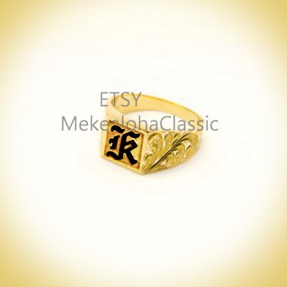 8mm Hawaiian Heirloom Signet Initial ring 14k gold Raised Black enamel or Gold letter Engraved Scroll Design #5 to #11
