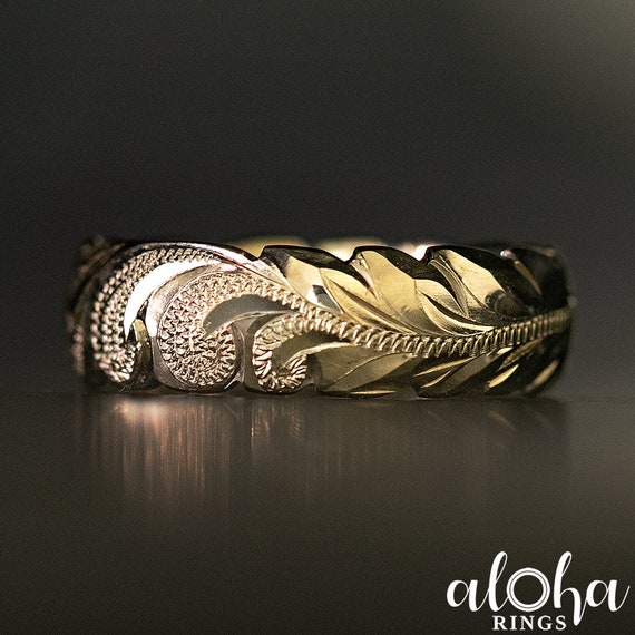 - Solid Gold Hand Engraved Ring [6mm] Hawaiian Maile Leaf Design Barre