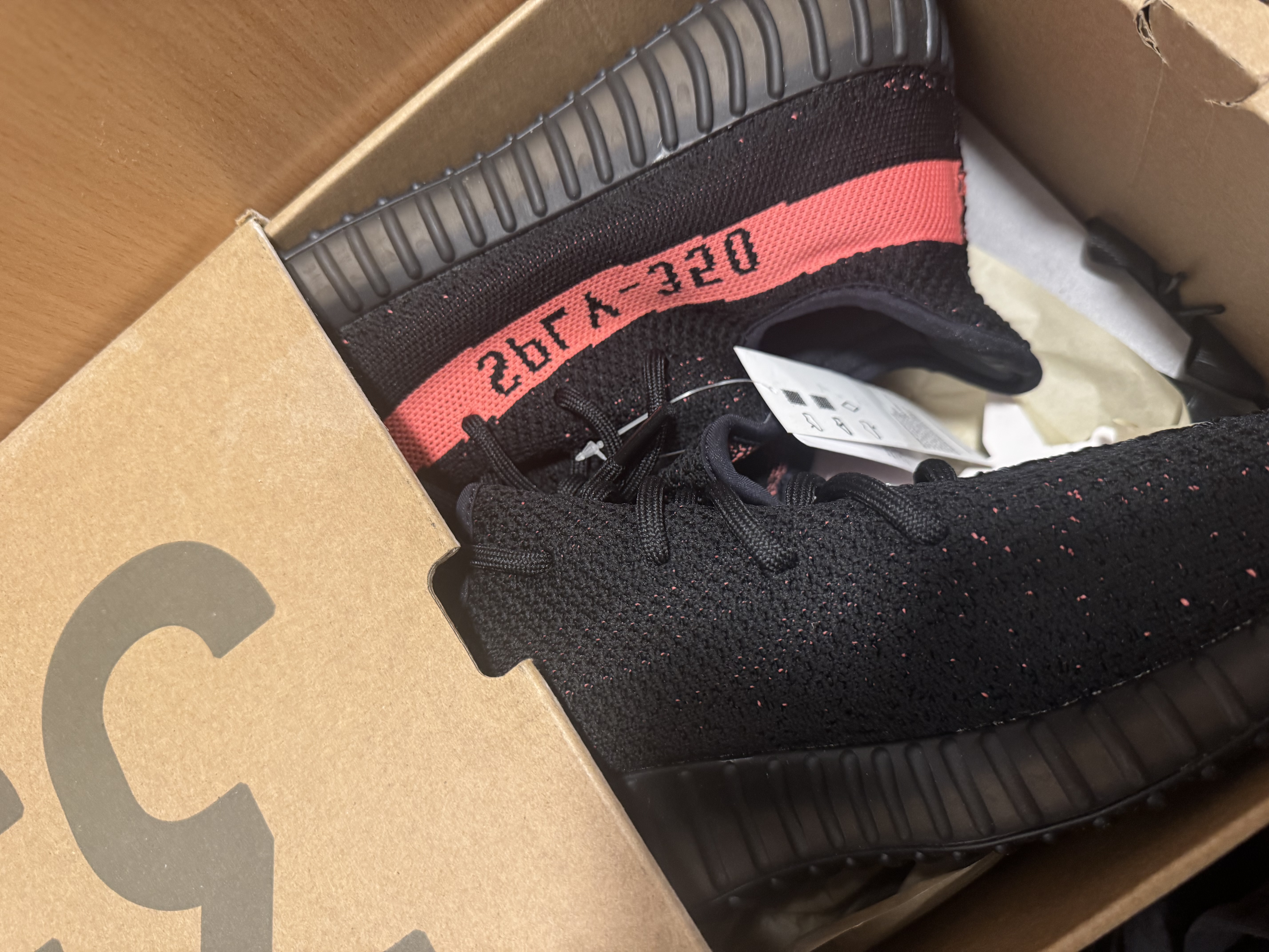 - Black yeezys with red writing top