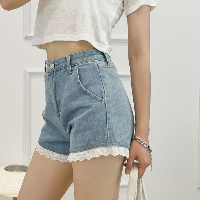 - Bluberlend High Waist Washed Lace Trim Denim Shorts YesStyle
