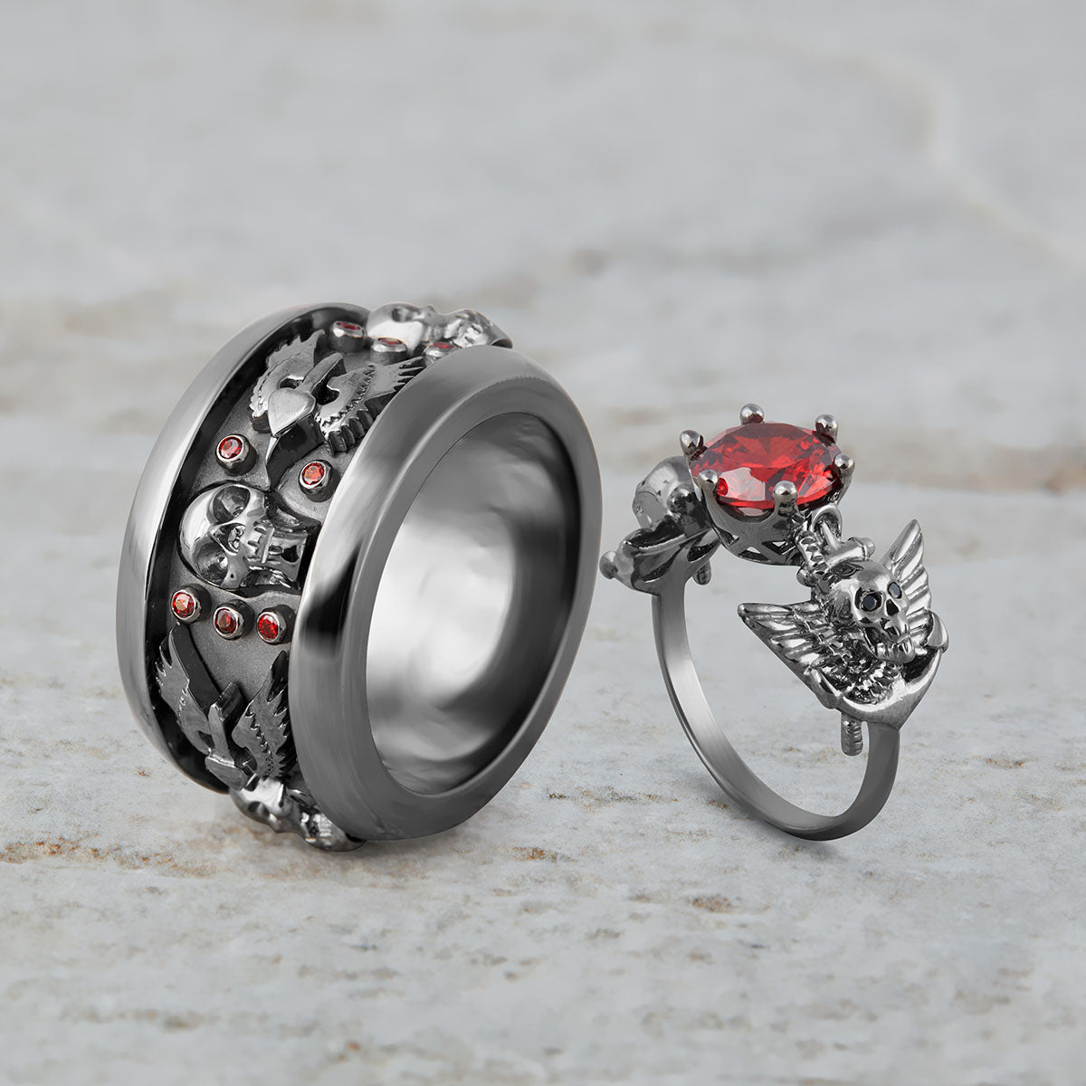 Dark Angel Wings Skull Rings Couple Gothic Engagement Ring Set
