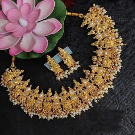 - Rhosyn Artificial Imitation Gold Copper Brass Metal Temple Jewellery Antique Traditional Stylish Ethnic Party Bridal Marriage Wear Gold Plated Choker