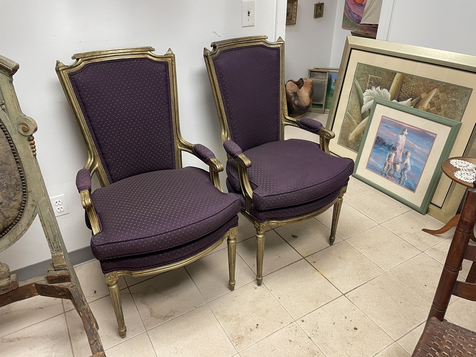 Set of Two Wood frame Purple Fabric Arm Chairs