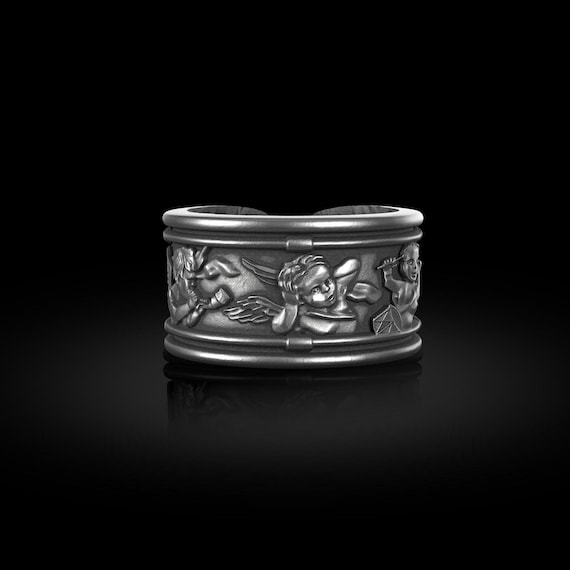 Ancient Design Baby Angel and Hearts Sterling Silver Band Ring