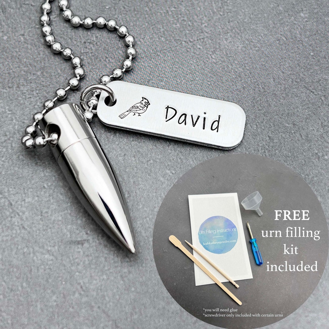 Cardinal and Bullet Urn Necklace, Personalized Cremation Jewelry, Name Necklace for Ashes, Remembrance, Memorial, Personalized Bereavement