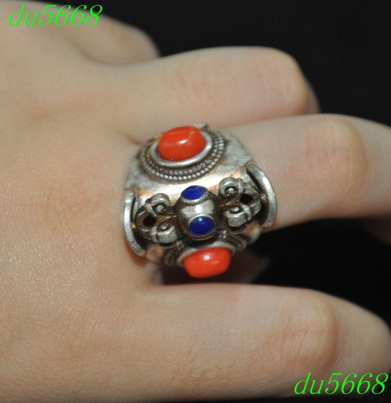 China Ancient dynasty Tibetan silver Red coral gemstone faqi statue Ring rings