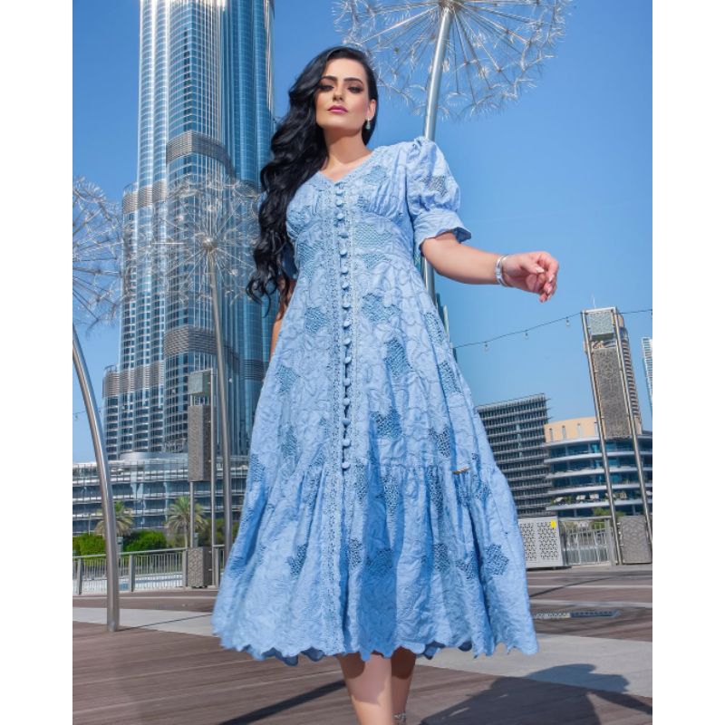 Vestido Midi Feminino Azul Bebê Evangélico Moda Cristã Renda 100