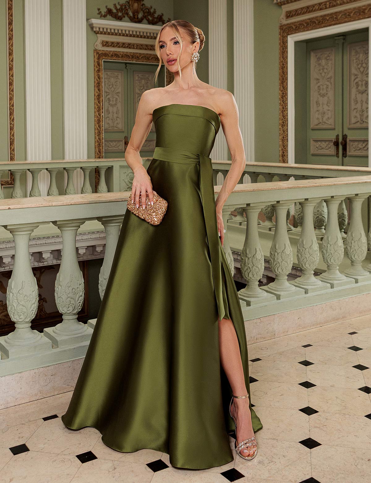 - Vestido Longo Verde Oliva em Cetim de Alcinhas