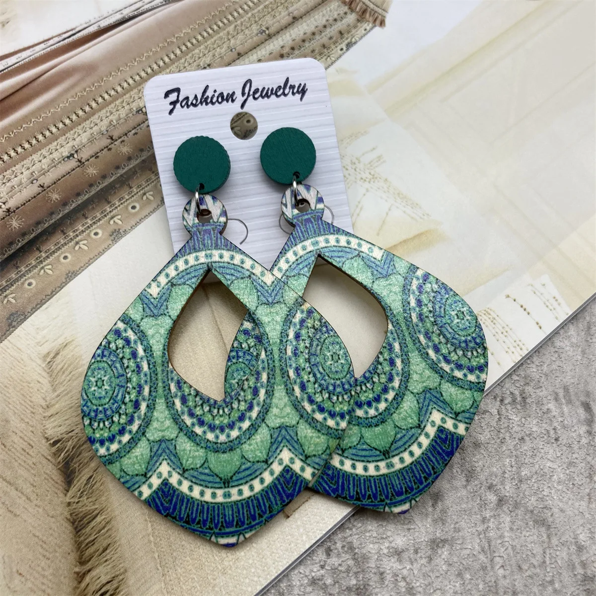 - Trendy Vintage Ethnic Round Wood Leather Drop Dangle Earrings For