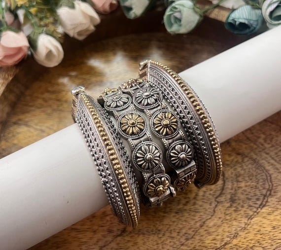 Oxidized Silver Gold Kada Bangles: Handmade Indian Tribal Jewelry