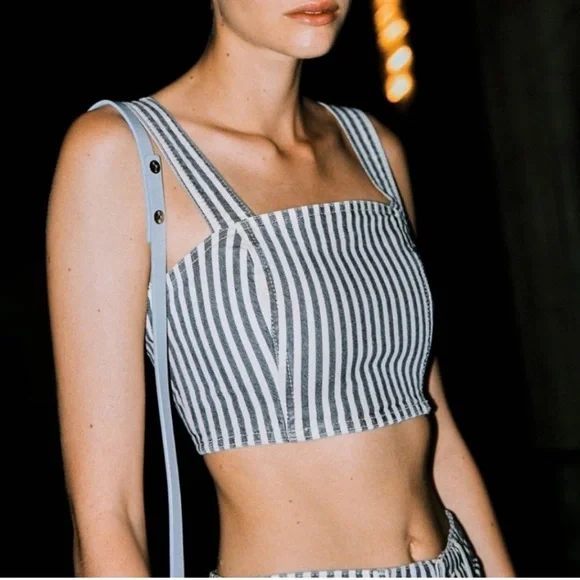 Boxing Day Zara Womens Denim Crop Top Size Small White Blue Striped Side Zip Bustier Tank Luxury