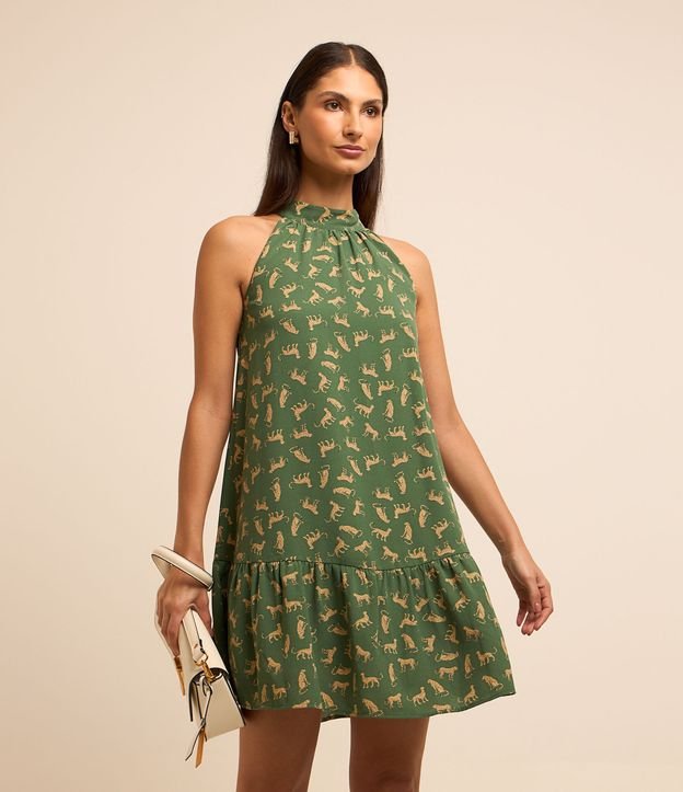- Vestido T-shirt Curto em Viscose com Bolsos Laterais Verde Militar