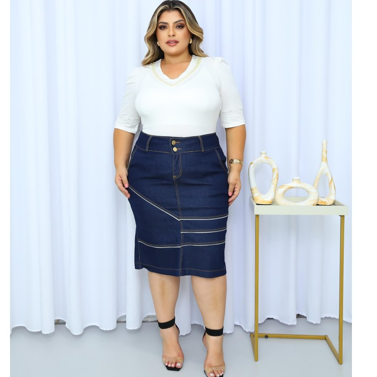 Saia Jeans Vilma Midi Plus Size – Cintura Alta com Elastano e