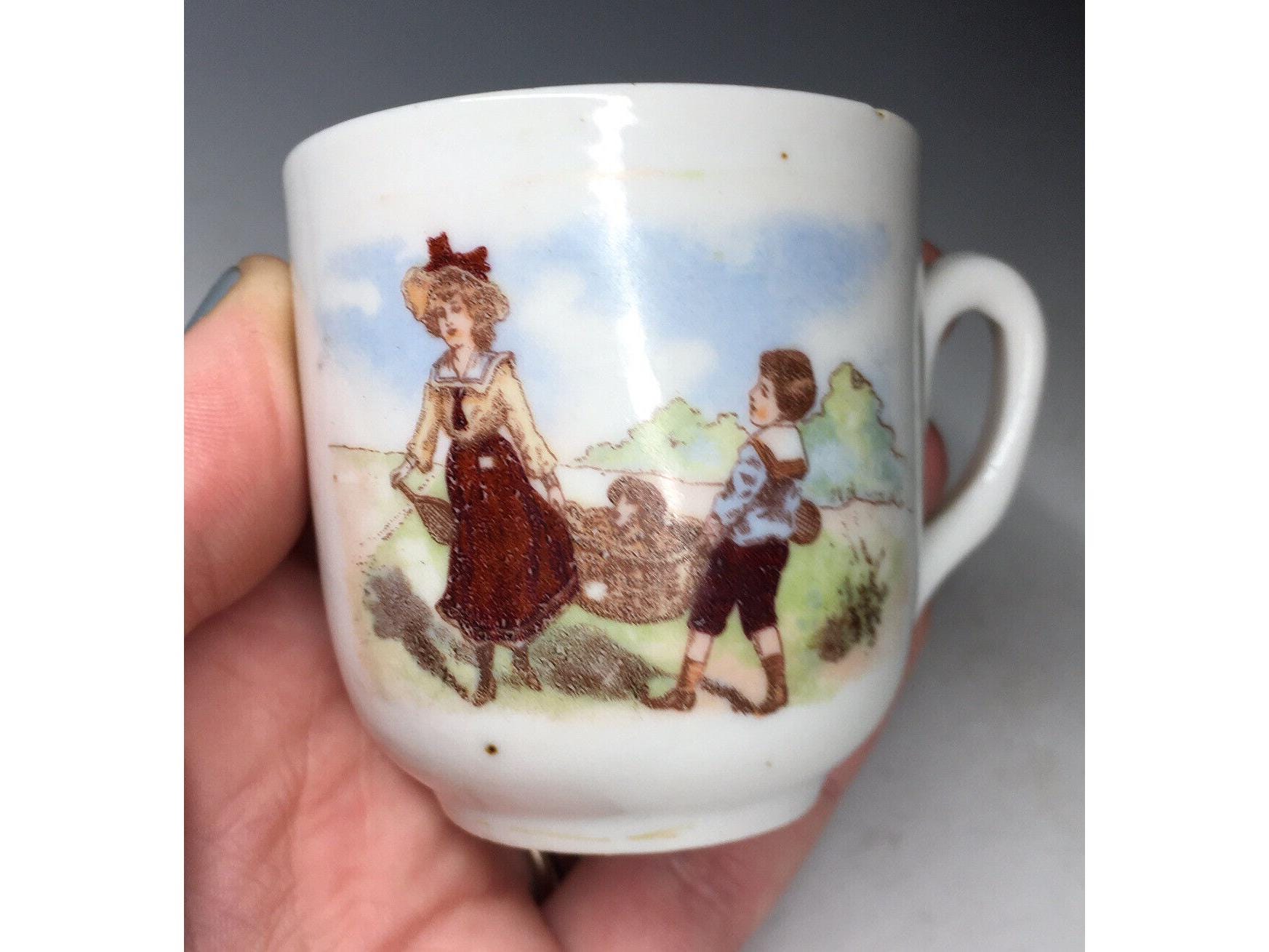 Antique Staffordshire Polychrome Transferware Child's Mug W/ Lady
