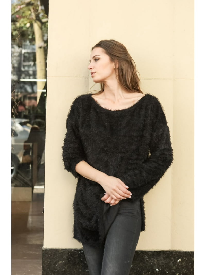 Melody Women Fuzzy Furry Sweater Knit Pullover Tunic Top Black