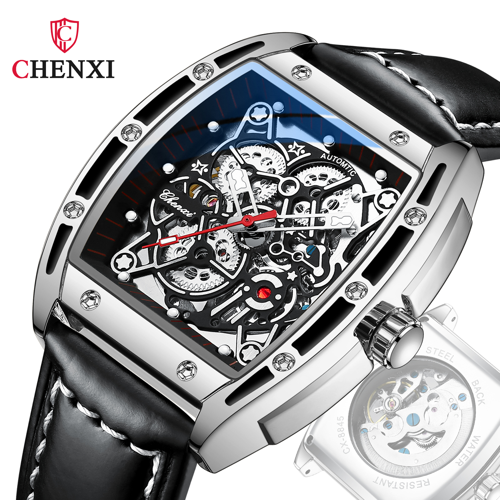 CHENXI-reloj mecánico 8865 preciso para hombre, correa de cuero genuino auténtico, reloj de mano de viaje con esqueleto luminoso