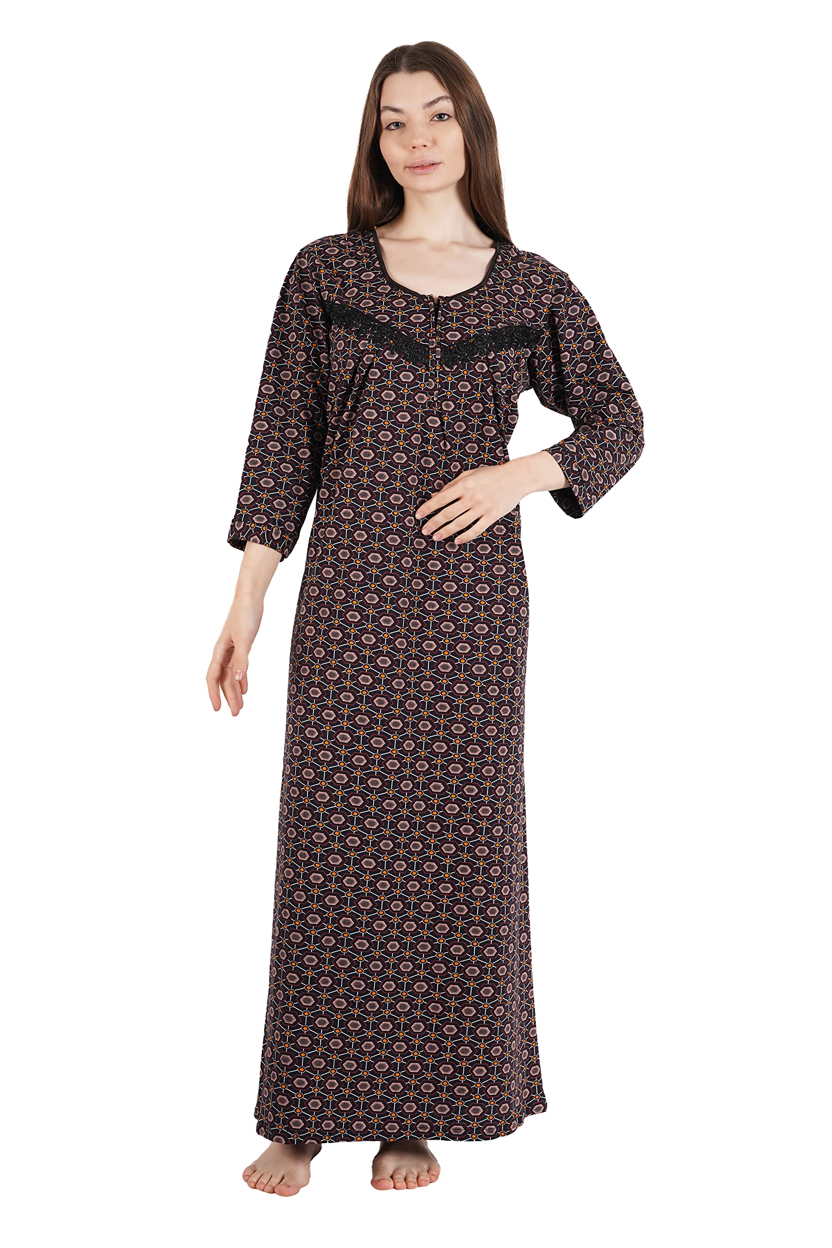 - Womenoire Lace and Printed Full Length Sinker Cotton Nighty for Women-Brown