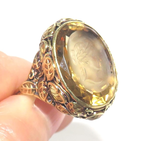 Arts and Crafts 14 K Gold Citrine Intaglio Ring With Carved