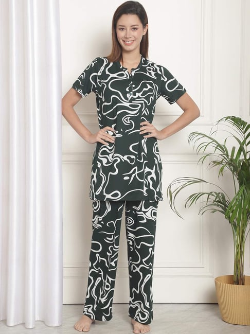 Kanvin Green Cotton Printed Tunic Pyjamas Set, Size Chart for Shoes TheOlawaleBrand Cheap Sale