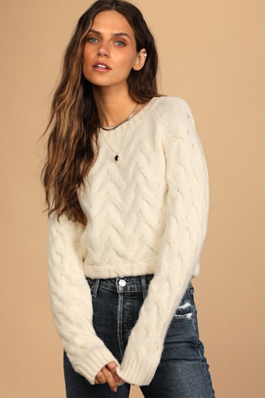 Cream Knit Sweater Cable Knit Sweater Cropped Sweater Lulus