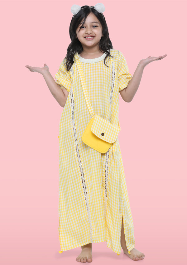 Product Name: Yellow Ivory Hand Block Check Printed Cotton Nighty Dress With Sling B