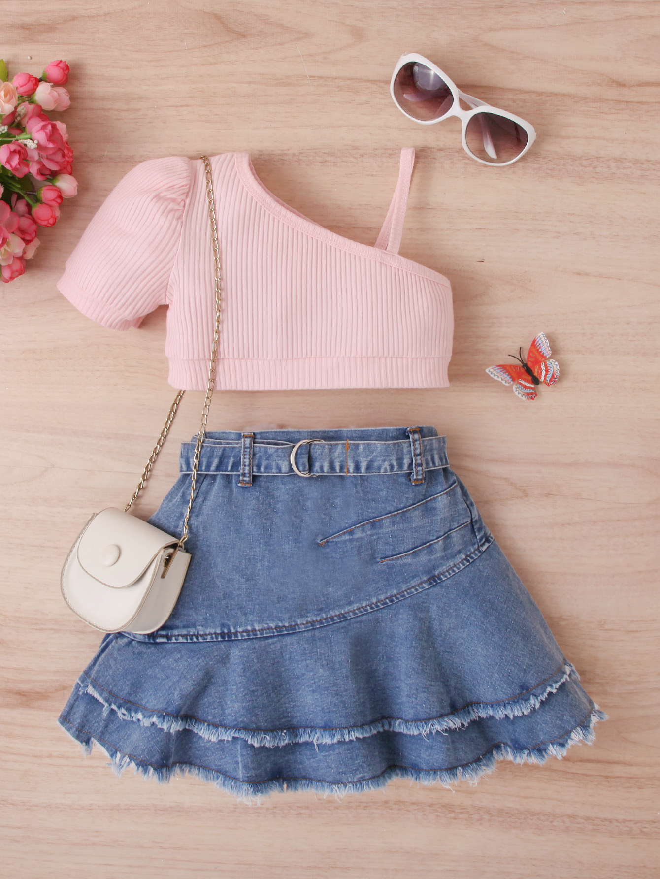 Children's One-Shoulder Suspender Tops Denim Skirt Sets