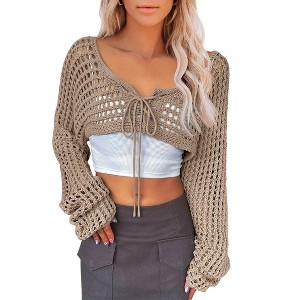 Coolmee Women's Cropped Cardigan Hollow Out Tie Up Long Bell Sleeve Sheer Crochet Shrug Bolero 2XL Khaki