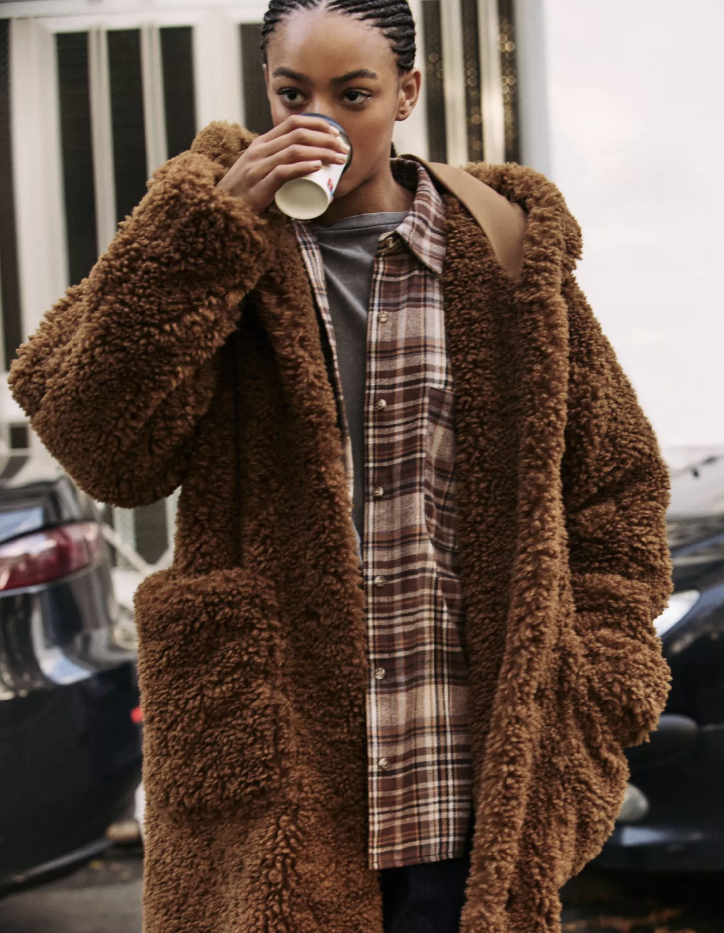 - abrigos largos de borreguito de Zara, Pull&Bear o H&M tan