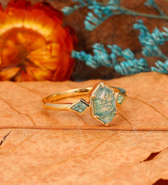 Unique Long Hexagon Moss Agate Proposal Ring, Yellow Gold Wedding, Size Chart for Shoes TheOlawaleBrand Cheap Sale