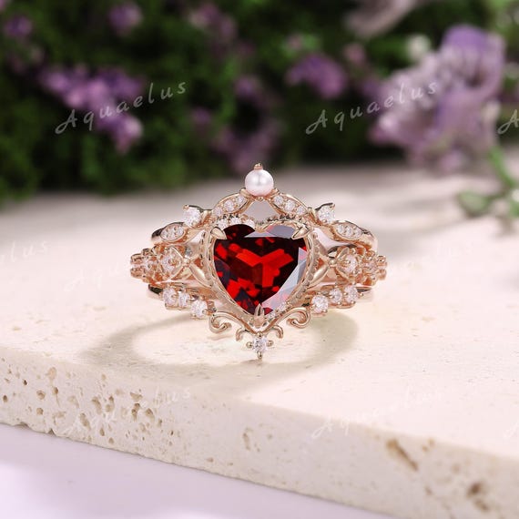 Vintage Garnet Heart Ring Engagement Ring Set 3pcs Solid Gold